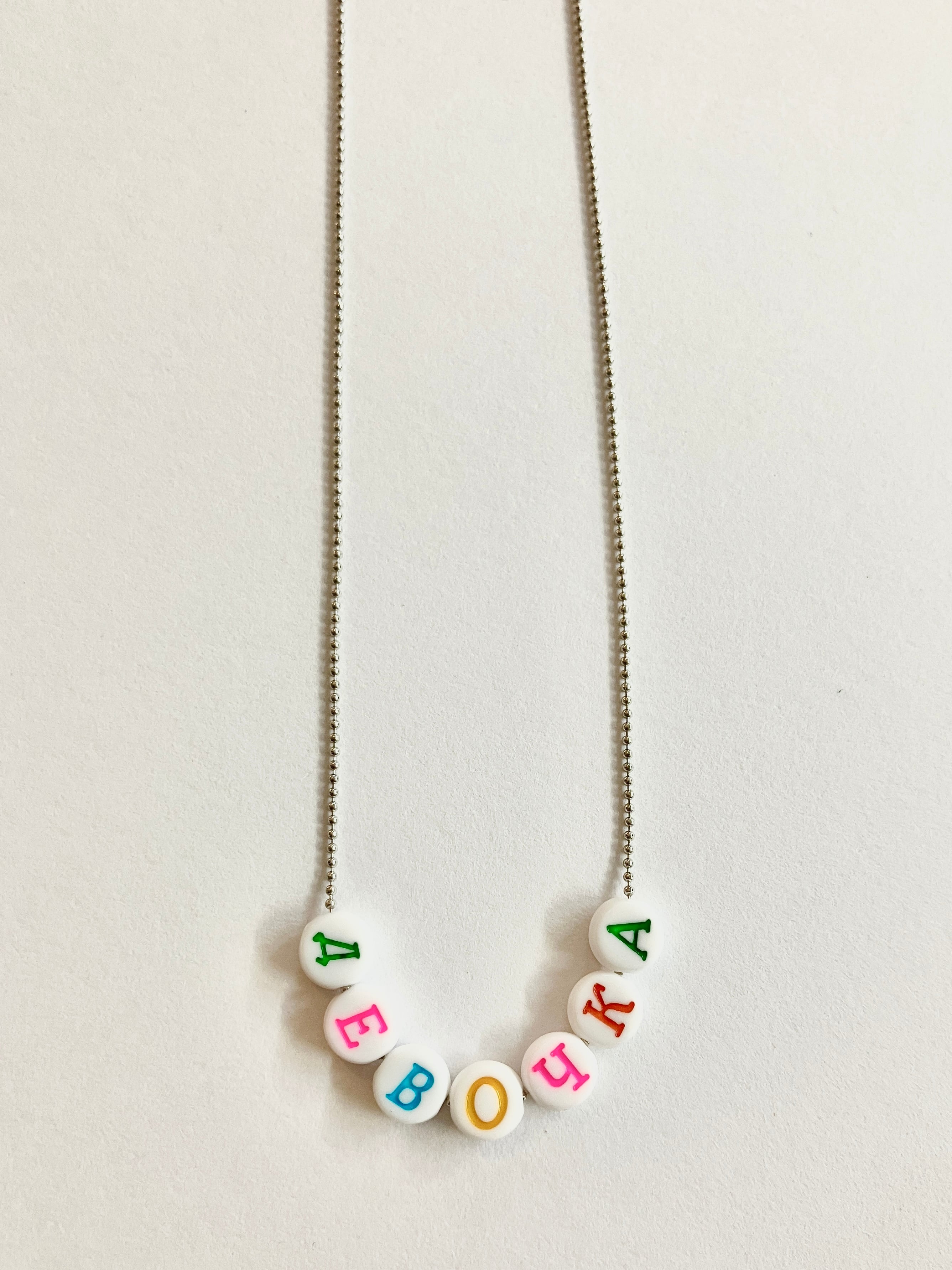 カラフルなキリル文字が並んだオリジナルネックレス。チェーンの色はシルバーです。