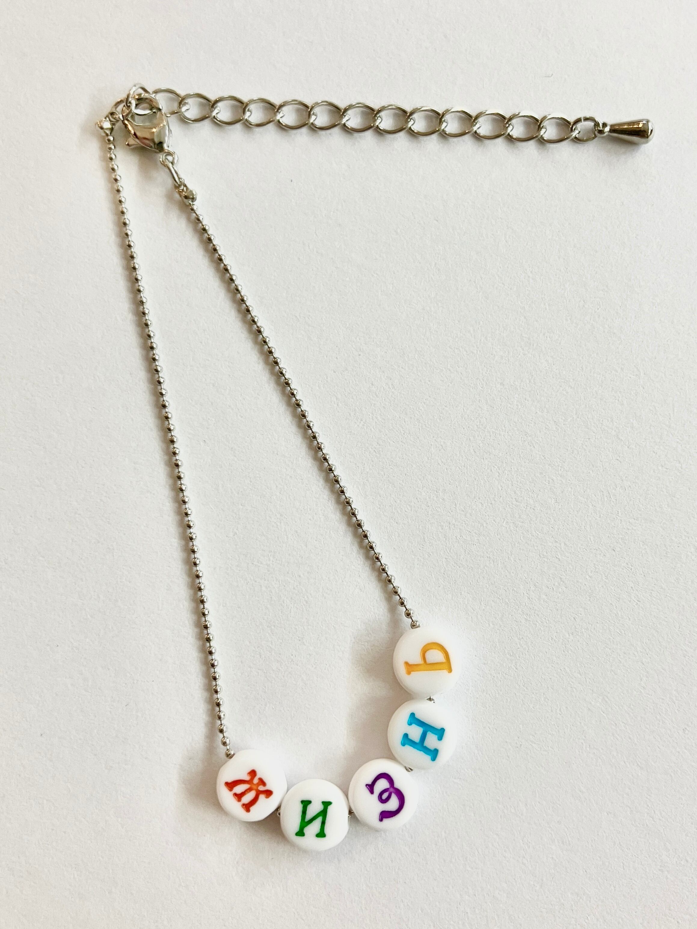 カラフルなキリル文字が並んだオリジナルブレスレット。チェーンの色はシルバーです。